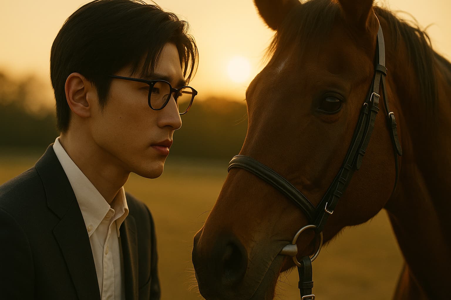 A. メガネ=観察者/理性の記号、馬=血統と夢の継承。ビジュアルと原作テーマが呼応します。