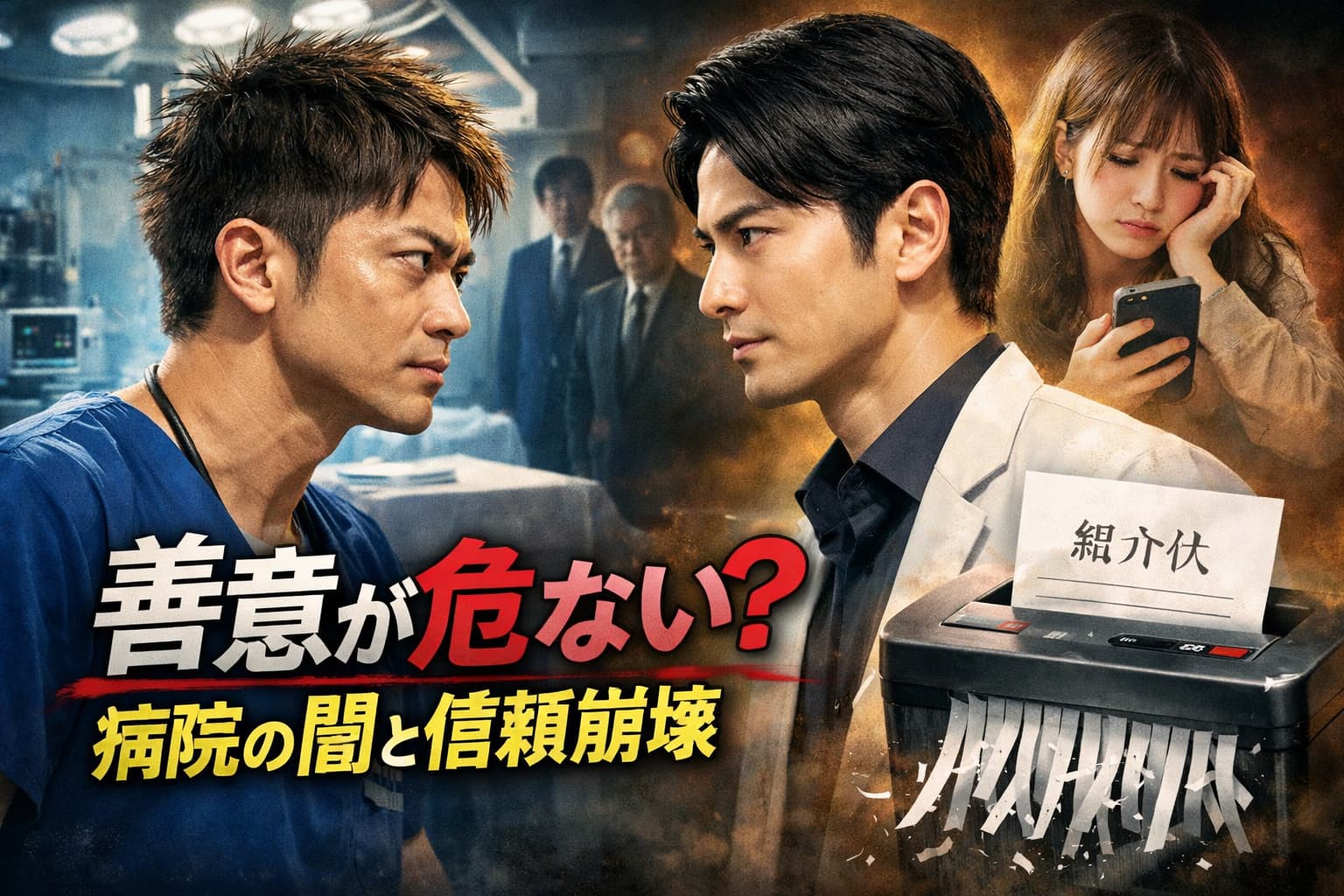 そして最後に残ったのは、紙が消える音。紹介状がシュレッダーに吸い込まれる、あの無音に近い轟音だ。手術の成功よりも、あの音のほうが長く耳に残る。医療は技術だけで動かない。記録と手続きと権力で、平然と歪む。そこに気づいた瞬間、この物語は“熱い医療ドラマ”ではなく、“信頼が壊されていくドラマ”に姿を変える。