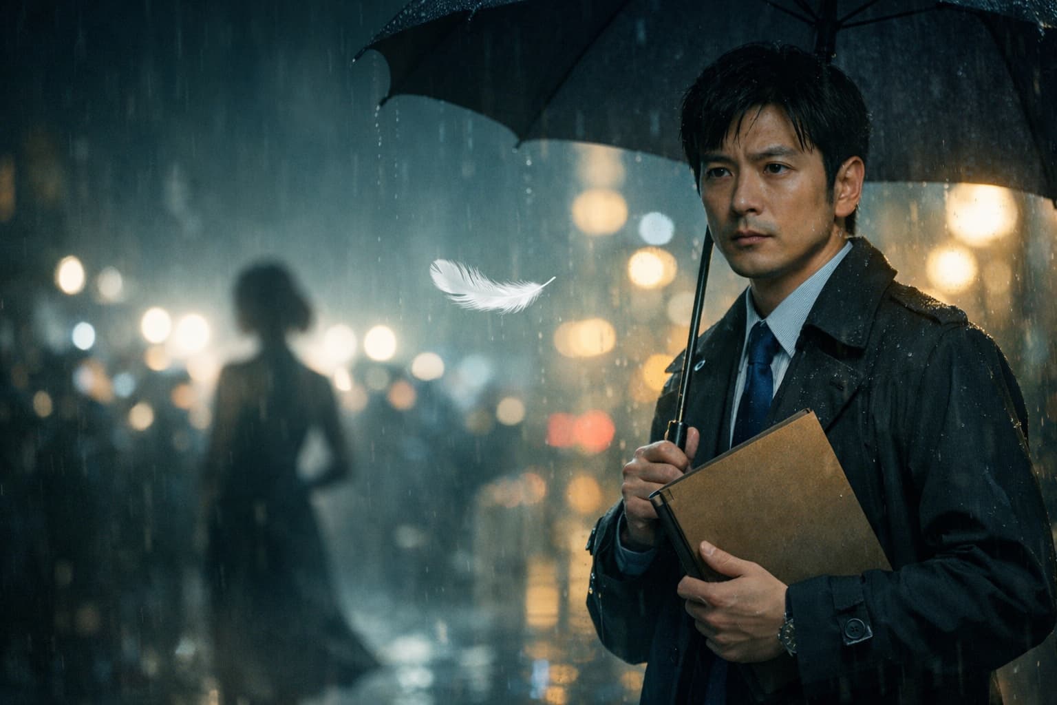 翌日、浦野は殺されていたことになっているのに、死因は刃物でも銃でもなく「心臓発作」で、胸元にぽつんと置かれた白い羽が“事件”を物語に変える。