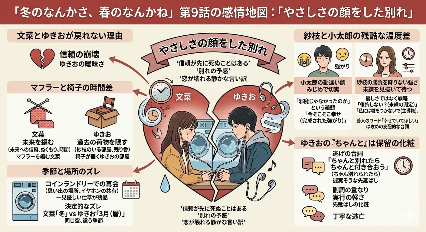 文菜はまだ冬の中にいる。寒さも、停滞も、ゆきおを好きだった時間も、その延長線上で感じている。誕生日を覚えていて、マフラーを編んで、コインランドリーという出会いの場所まで来た。感情の季節がまだ冬から動いていない。対してゆきおは、もう暦のほうへ寄っている。「3月だよ」と返したあの一言には、現実へ戻ろうとする感じがある。季節の認識が違うというより、今どこに立っていると思っているかが違う。