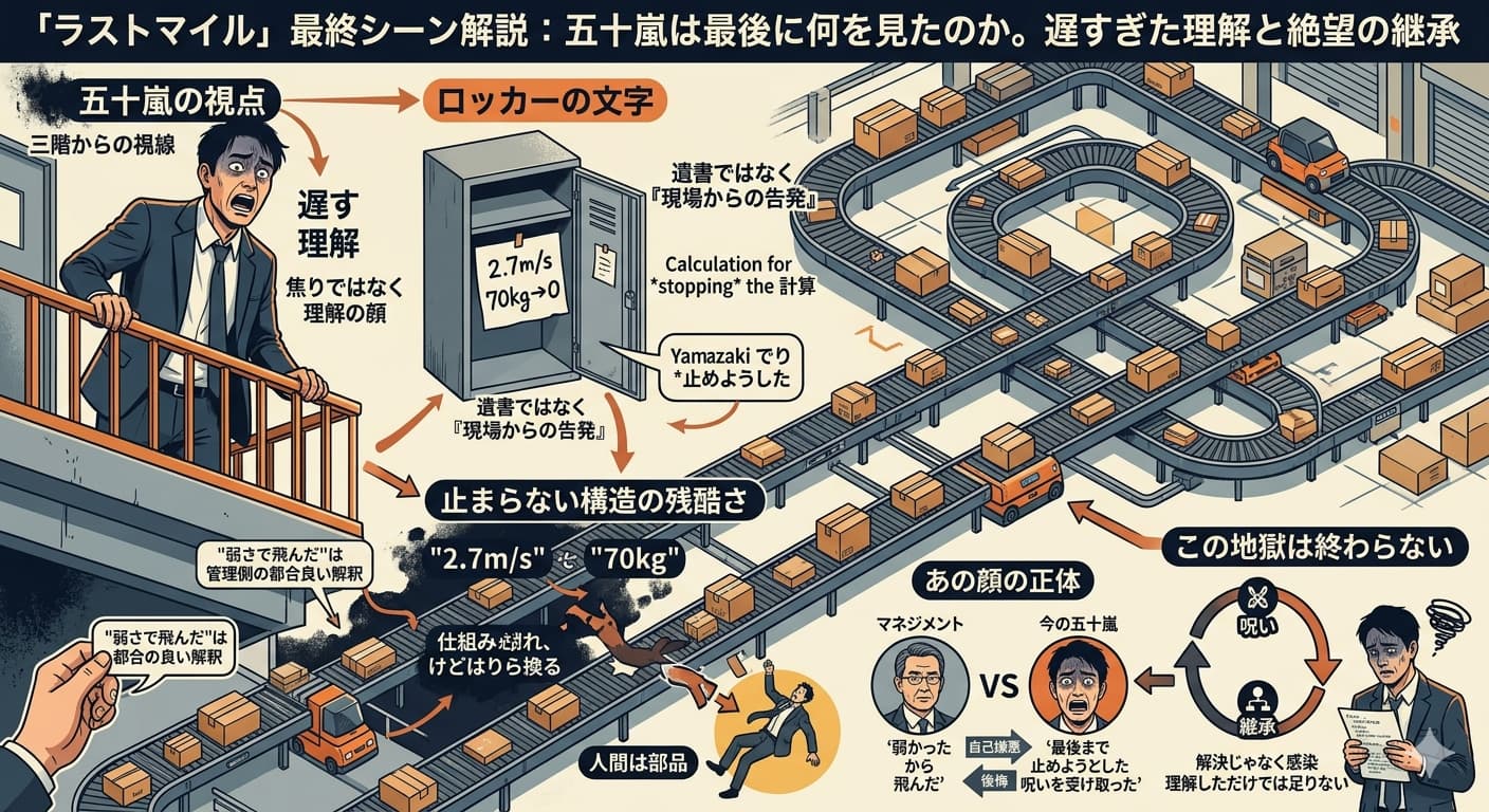 あそこで五十嵐が見たのは現場じゃない。自分が止めなかったものの正体だ。山崎は弱かったんじゃない。止まらない物流の前で、人間のほうが先に壊れただけだった。その事実が、最後の数十秒で一気に突き刺さる。