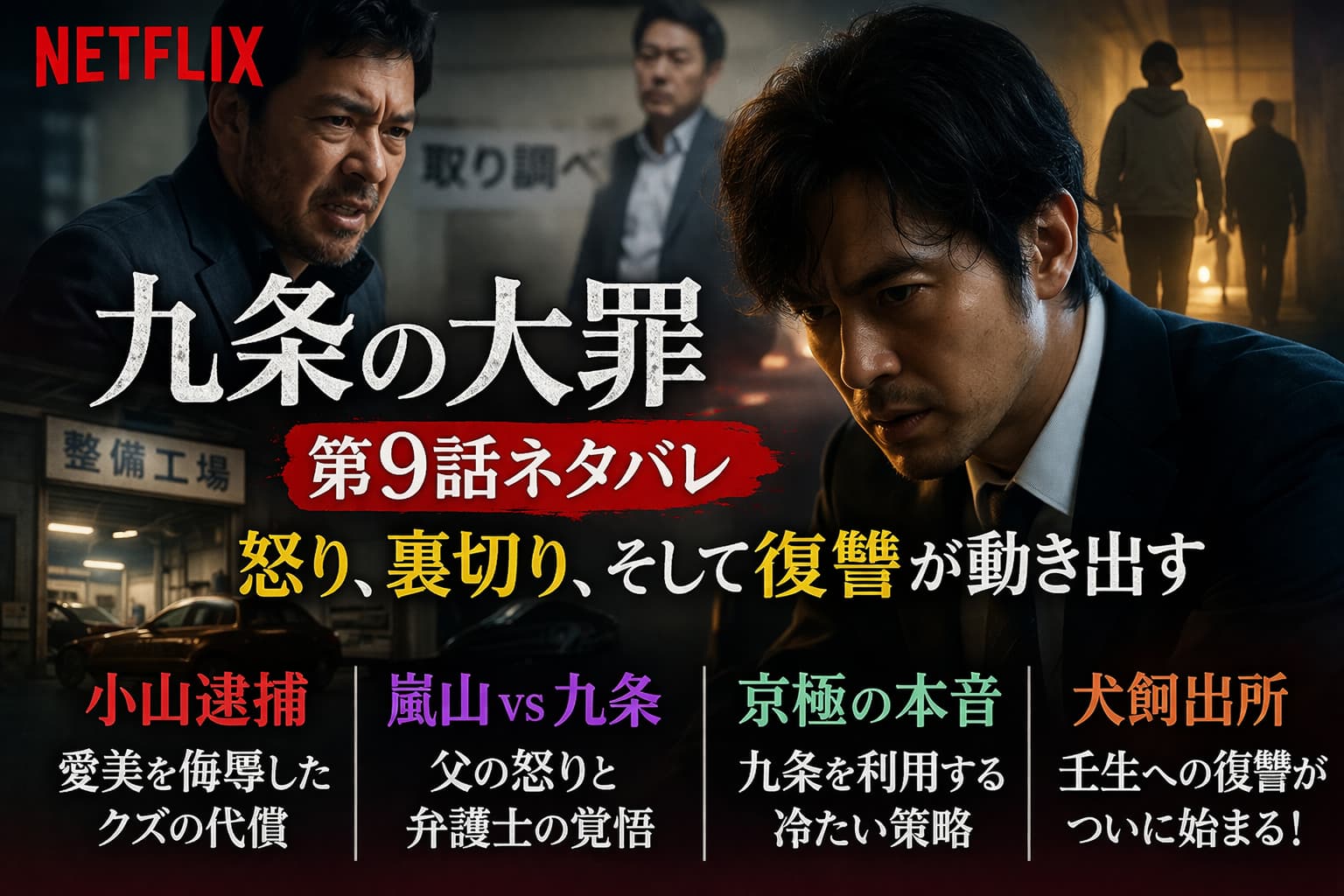 Netflix『九条の大罪』第9話は、事件が動いたというより、人間の怒りと執念がむき出しになった回だった。