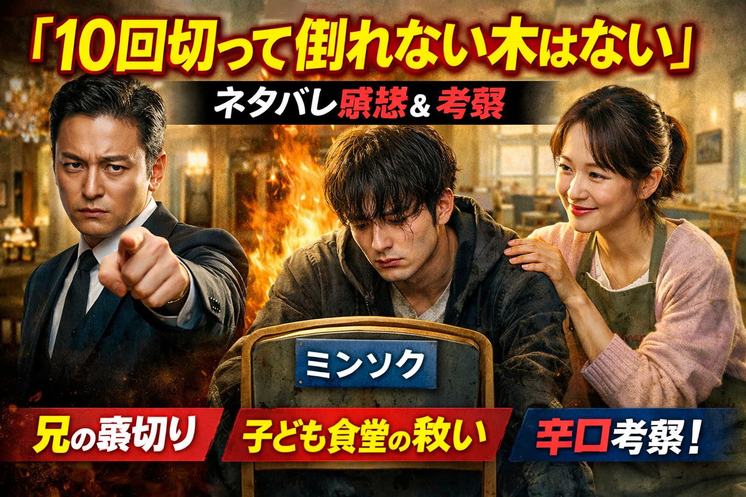 だから子ども食堂の存在は、単なるほっこり要員ではない。物語全体の温度を調整する装置であり、ミンソクの壊れ方を測る基準でもある。ここがあるから、彼がどれだけ外で追い詰められているかが見える。そしてここがあるからこそ、まだ完全には終わっていないとも思える。救いは派手じゃない。けれど、派手な裏切りより長く残る。そういう作りになっていた。