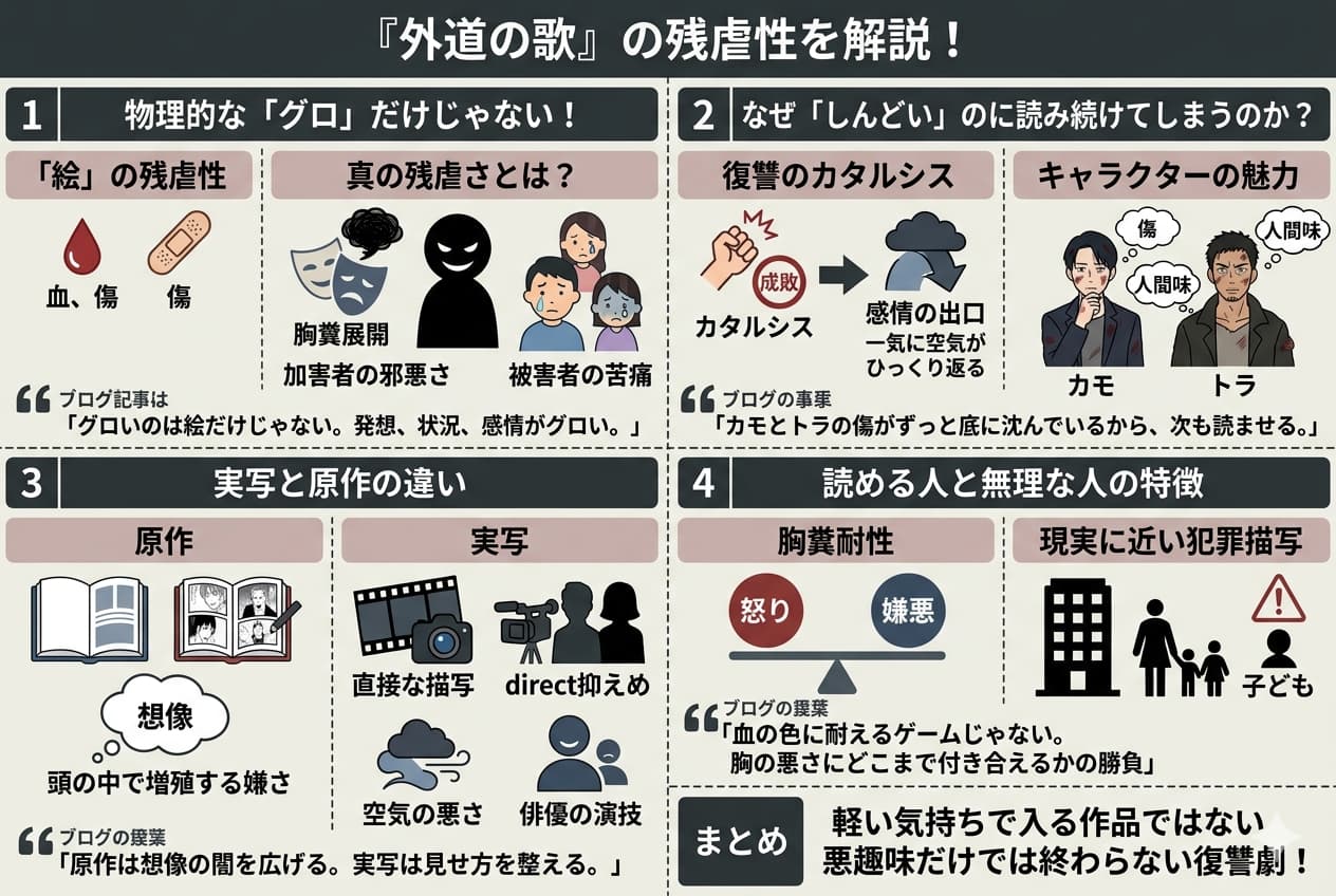外道の歌のグロを語るとき、雑に「血が多い」「拷問がきつい」で片づけると、この作品の嫌らしさをまるごと取り逃がす。