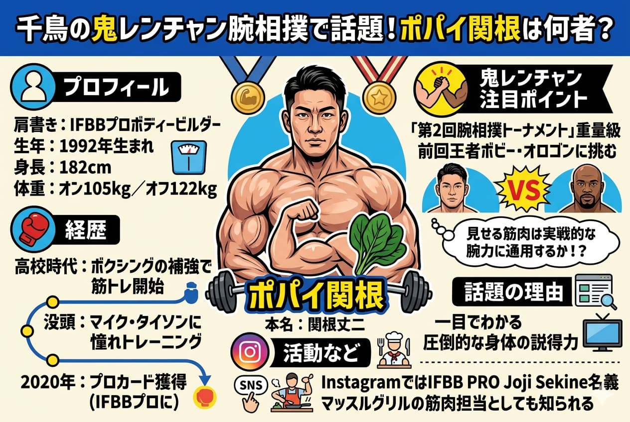 この記事では、鬼レンチャンで話題のポパイ関根さんについて、何者なのか、本名、年齢、身長、体重、経歴、結婚の噂、腕相撲で注目される理由までわかりやすくまとめます。