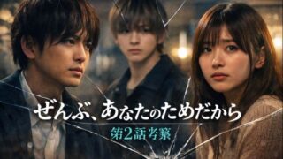 ぜんぶ、あなたのためだから 「ぜんぶ、あなたのためだから」第2話ネタバレ──優しさが凶器になる夜、誰もが嘘を抱いていた 優しさは、時に一番鋭い刃になる。第2話の林田和臣(藤井流星)は、その刃を自分の胸に突き立てながらも、まだ「信じる」という名の幻を見ていた。 橋本智恵(大原優乃)の笑顔の裏にあるものは、救いか、それとも誘いか。コンカフェ、亡き妻の影、そして「... 2026.01.18 ぜんぶ、あなたのためだから