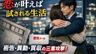 ロビーでの抱擁は、甘いゴールのはずだった。けれど胸に残ったのは、ときめきよりも“生活が揺らぐ音”だ。 密告メール、部署異動の脅し、マーヴェリックの正体暴露、そして週刊誌と敵対的TOB――恋が実った瞬間から、ふたりの足元は試されはじめる。 な...