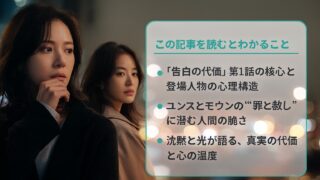 『告白の代価』第8話は、「真実の告白」がもはや救いにならないことを突きつける回だった。モ・ウン=カン・ソヘという衝撃の事実。アンの逃走。そして、セフンの死体発見――。第7話までの“嘘の連鎖”が、第8話で一気に現実へと変わる。沈黙が破られ、復讐が暴走を始める瞬間、観る者は気づく。この物語は「真犯人探し」ではなく、「真実に耐えられない人間たち」の話だと。