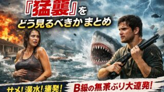 猛襲 Netflix映画「猛襲」ネタバレ考察・感想 微妙なのに妙に見てしまう、サメ×ハリケーンの変な中毒性 『猛襲』は、ハリケーンにサメをぶち込めば勝ちだろという乱暴な発想で走り出し、そのまま最後まで突っ走る映画だ。 怖がらせたいのか、笑わせたいのか、泣かせたいのか。その全部を一気にやろうとして、だいたい全部こぼしている。なのに、なぜか途中で切る... 2026.04.12 猛襲